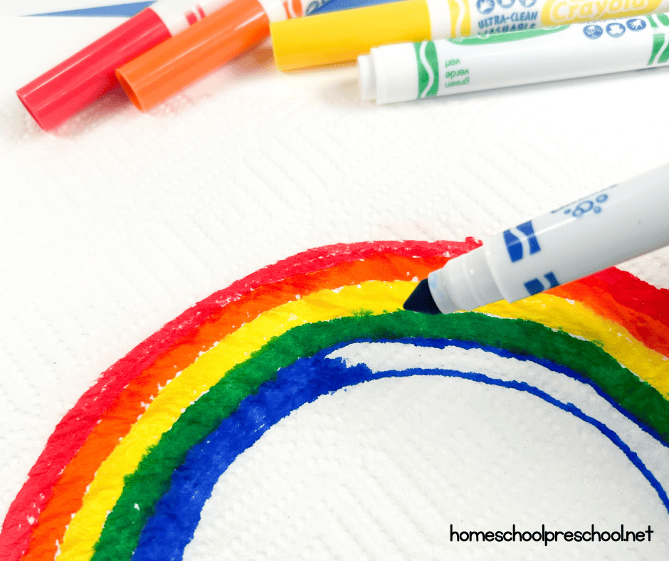 - Grab your paper towel and draw a big, bright rainbow with your markers.