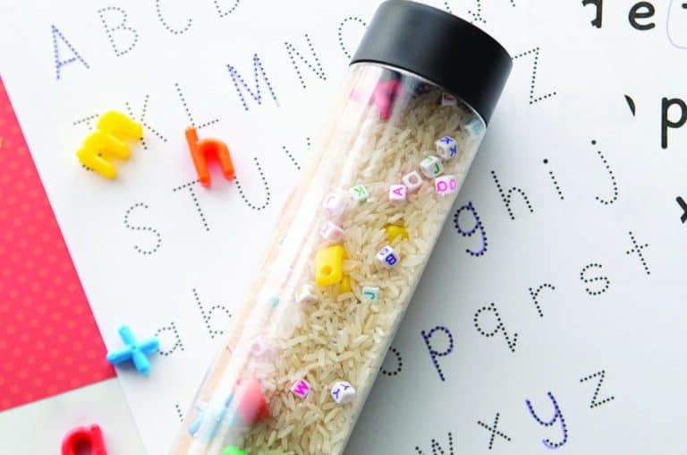One way to introduce the alphabet is by tracing letters together. You can print out a letter tracing sheet, or you use a letter stencil to help your child trace the letters.