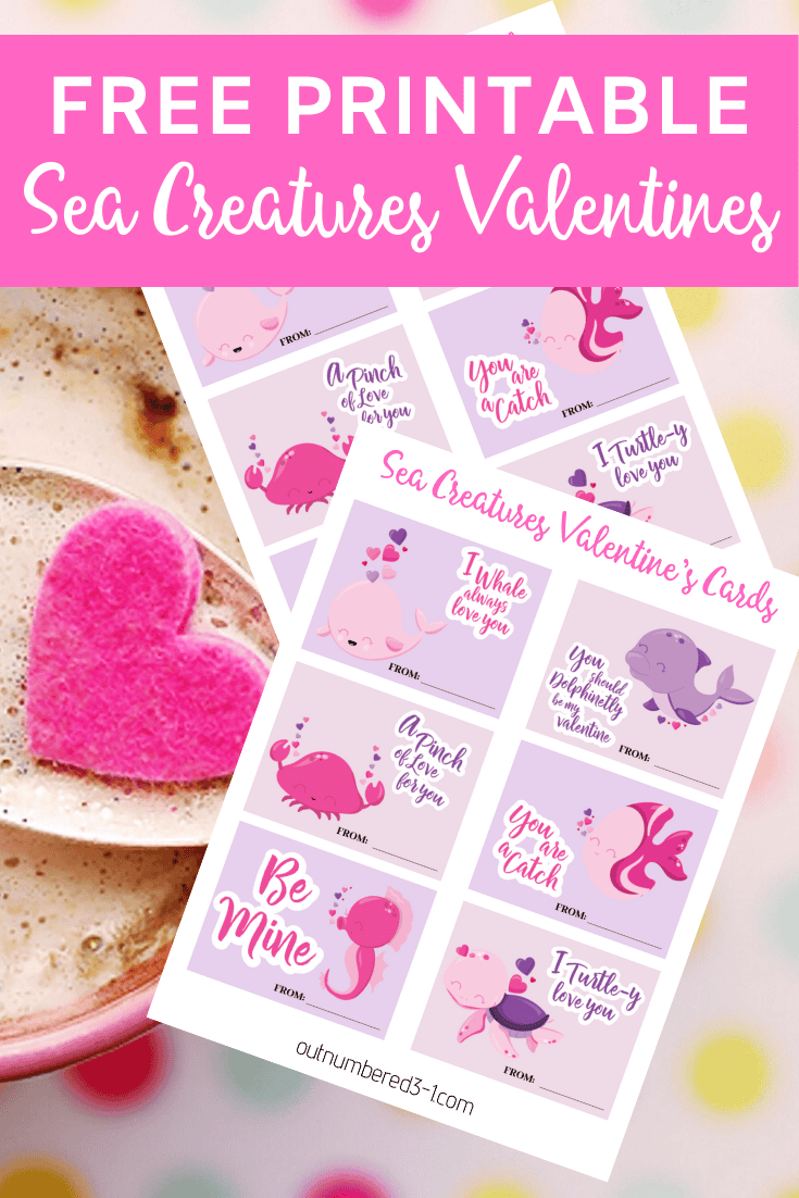 These adorable printable sea creatures Valentines are free to download, and are perfect for classroom Valentine’s exchanges at school. There are 6 designs per printed page, so you can just multiply and print as many pages as you will need.