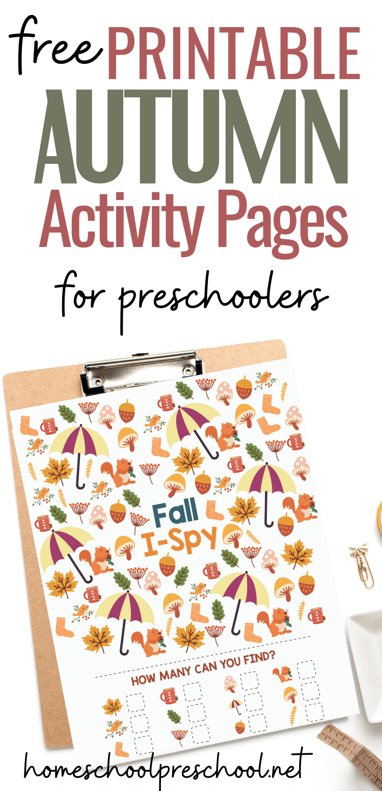 • Fall I Spy – Children will hunt for various fall-themed objects on the page. They’ll count them and write the number in the box. This page will help kids work on counting and writing numbers while strengthening visual discrimination.