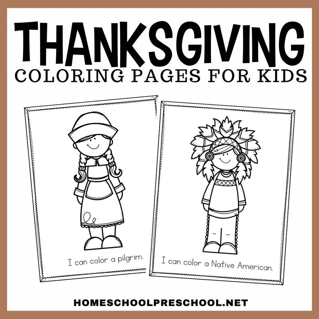 This pack includes twelve pages featuring Native Americans, Pilgrims, a turkey, and various Thanksgiving foods.