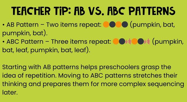 - Understanding pattern types: ABC patterns (three repeating elements) encourage children to look beyond simple AB repeats and stretch their thinking.