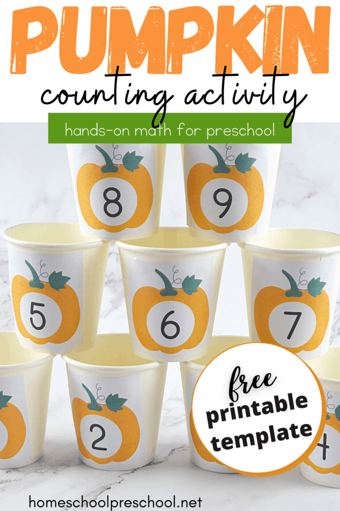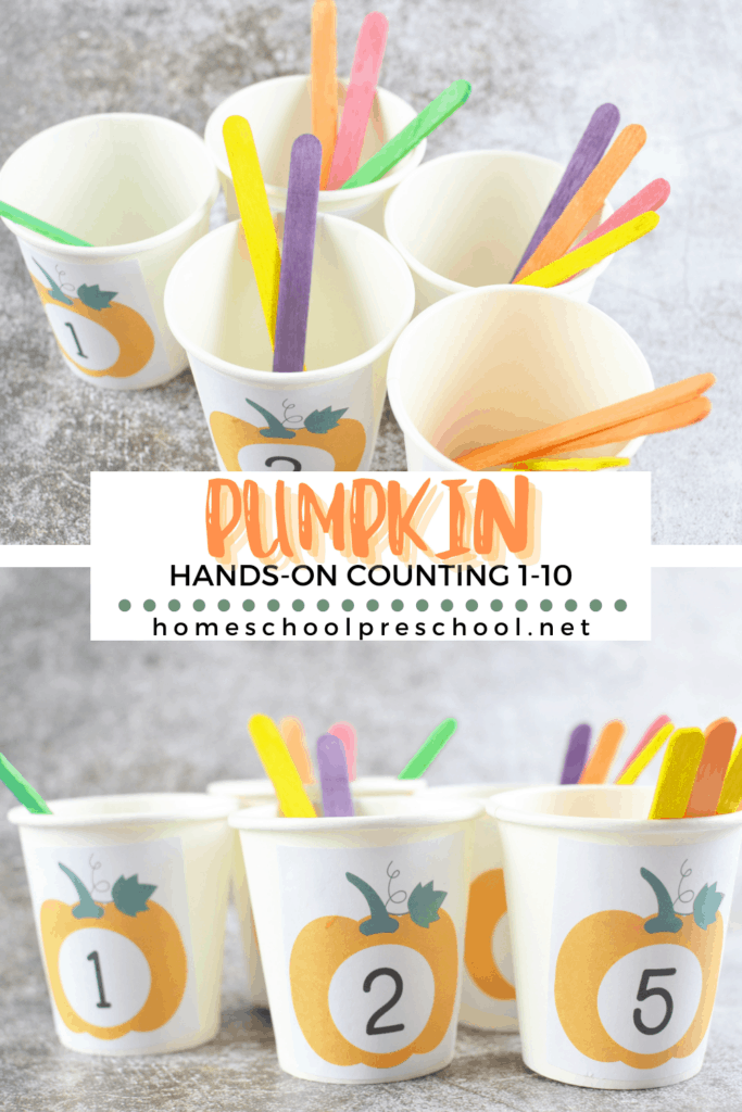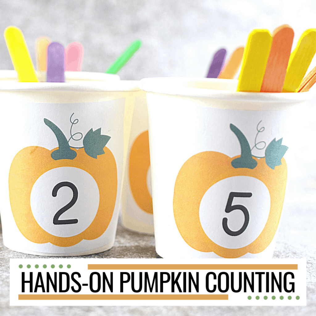 To get started, you’ll need a set of paper or plastic cups, craft sticks, and a printer. Print the numbered pumpkins on printer paper. Glue or tape them to the front of each cup.
