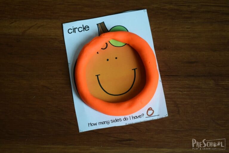 These happy face pumpkins are such a fun way for toddler, preschool, pre k, and kindergarten age students to learn shapes for kids! Simply use play doh and these shape playdough mats.