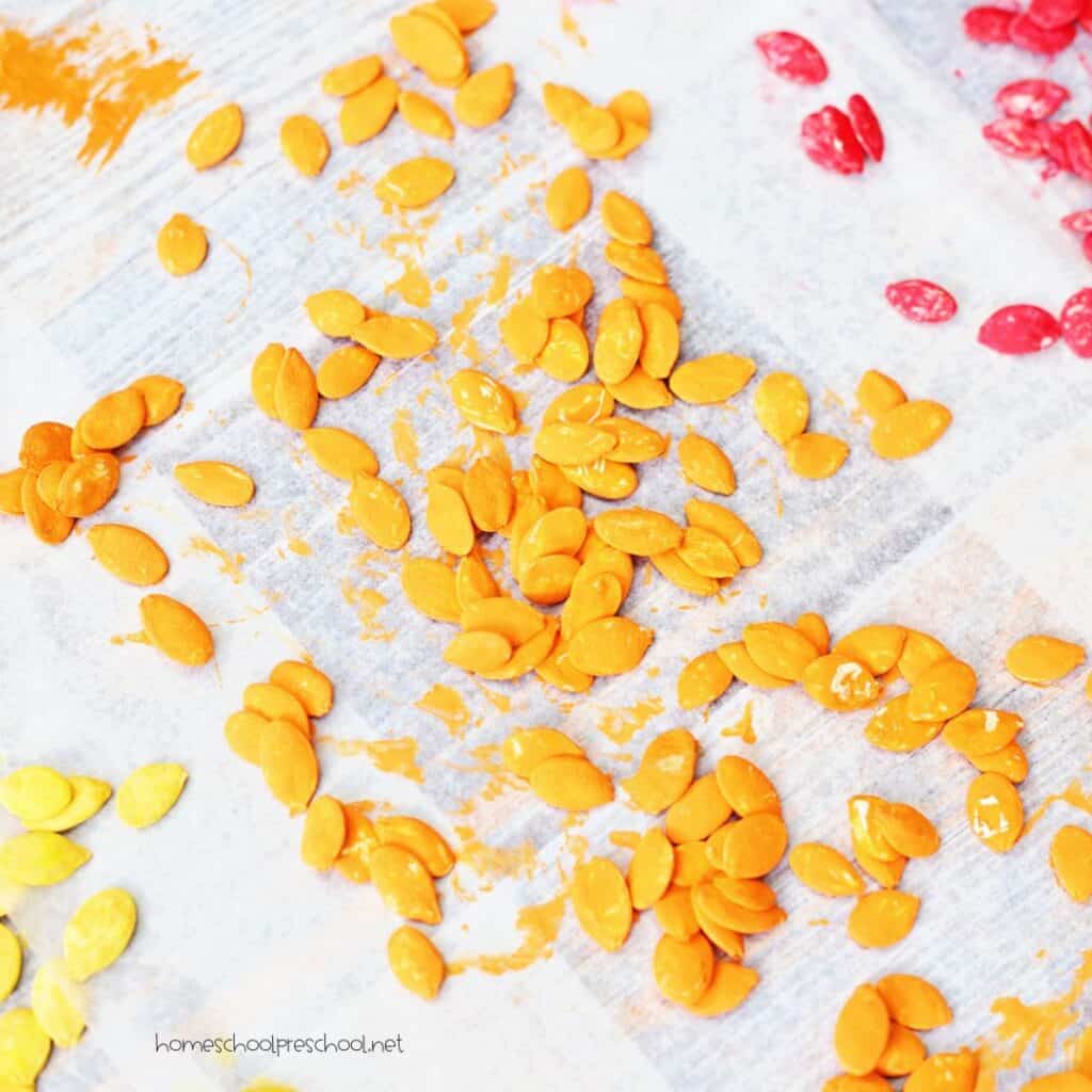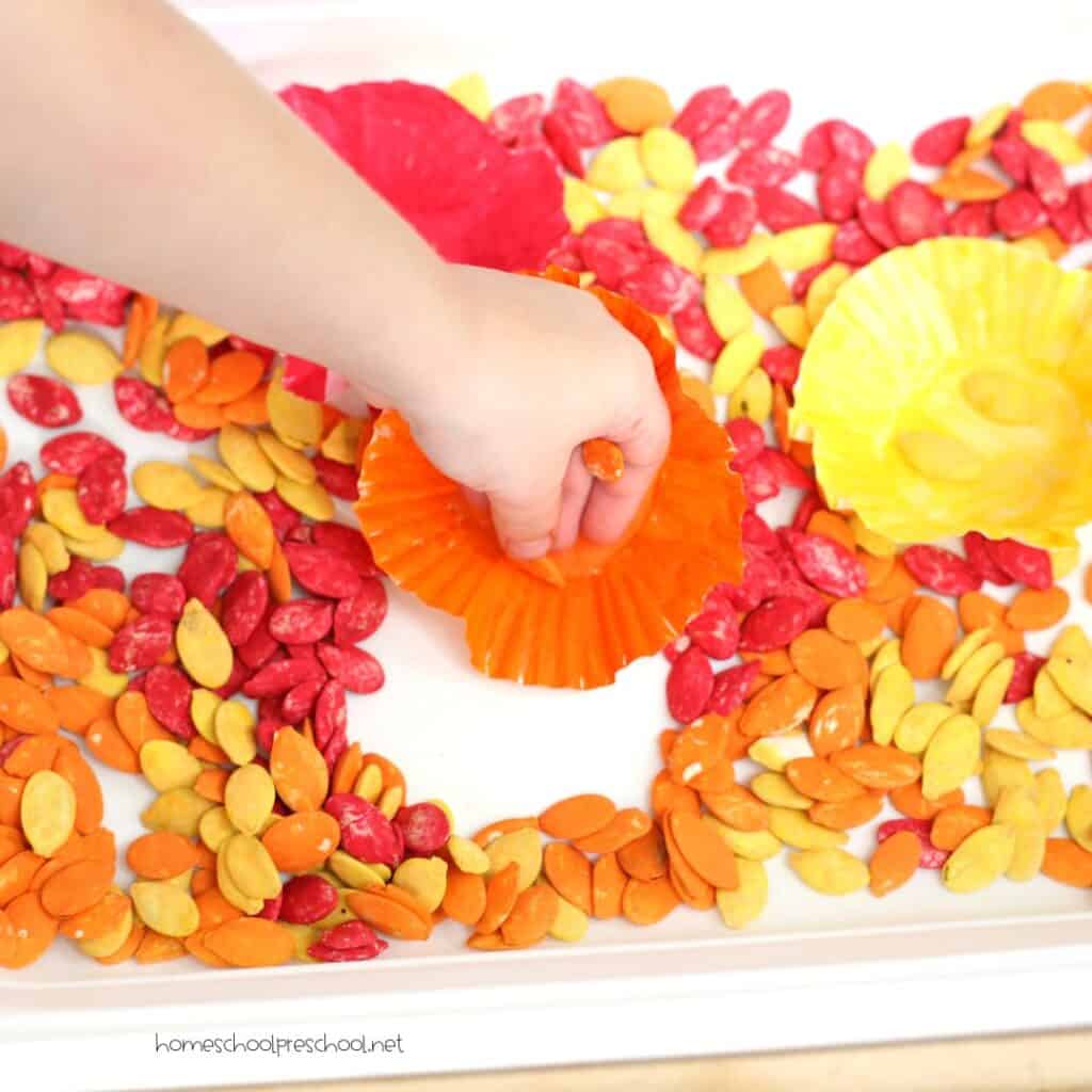 Download our instructions, grab a few supplies, and set up this colorful pumpkin seed sensory bin for hands-on fall fun.