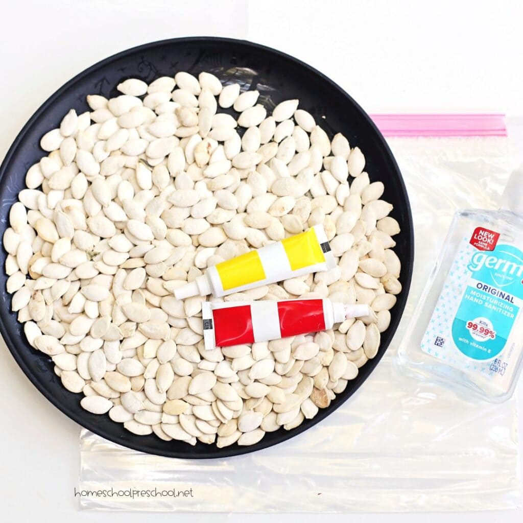Place your clean, dry pumpkin seeds into separate zip-top bags—one bag for each color you’d like to create. Add a small squirt of hand sanitizer and several drops of food coloring. Seal the bag tightly and shake until the seeds are evenly coated.