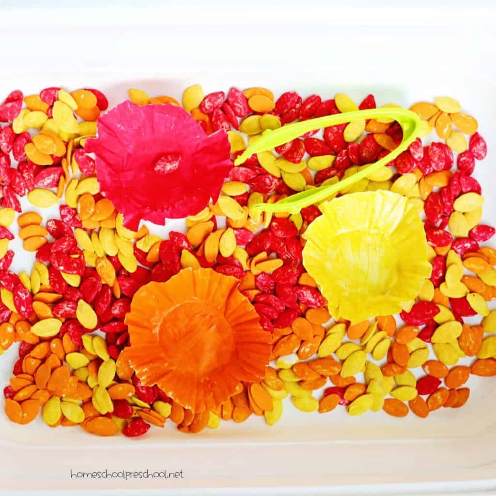 Place cupcake liners inside the bin, one for each seed color. Add tools like tongs, tweezers, or spoons for kids to use as they sort.