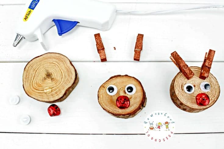 - Take a wood slice and glue two googly eyes near the top center to make Rudolph’s eyes. Just below the eyes, glue on a red jingle bell (or red pom-pom) to be Rudolph’s shiny nose.