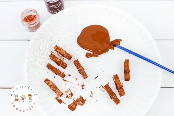 Let’s start by painting all our clothespins with nice, warm brown like real antlers! While the paint is still wet, we’ll sprinkle a little glitter on top to make them sparkle. Now, let’s set them aside to dry completely before moving on to the next step.