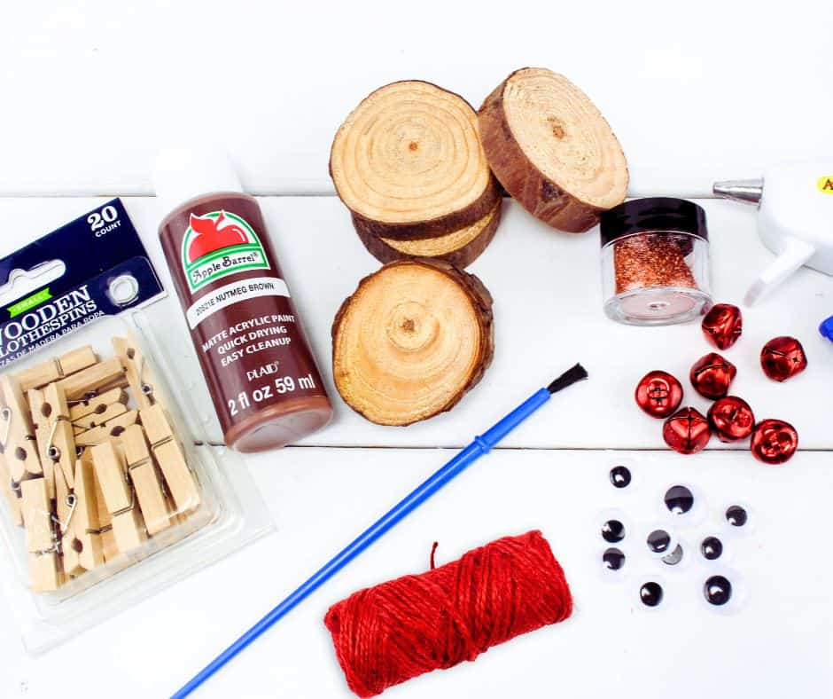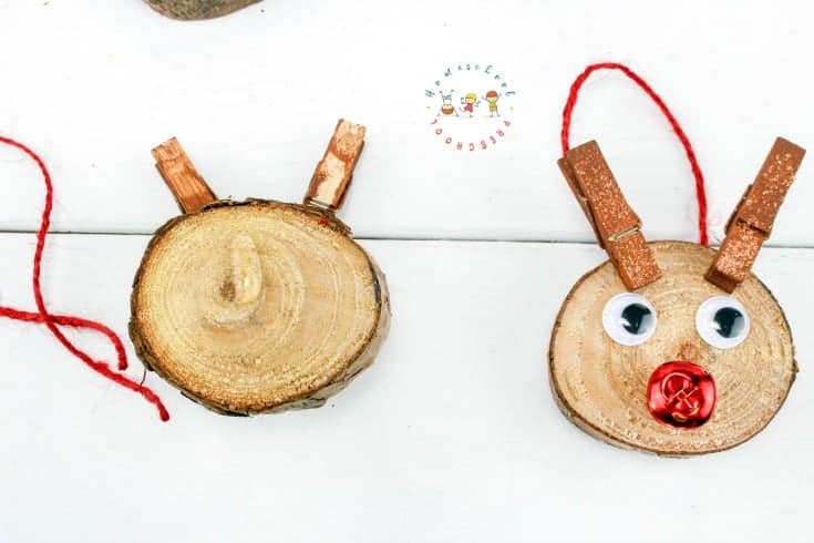- Once the clothespins are dry, clip or glue two to the top of each wood slice to look like antlers. Make sure they’re secure so they can stay in place when you hang the ornament.