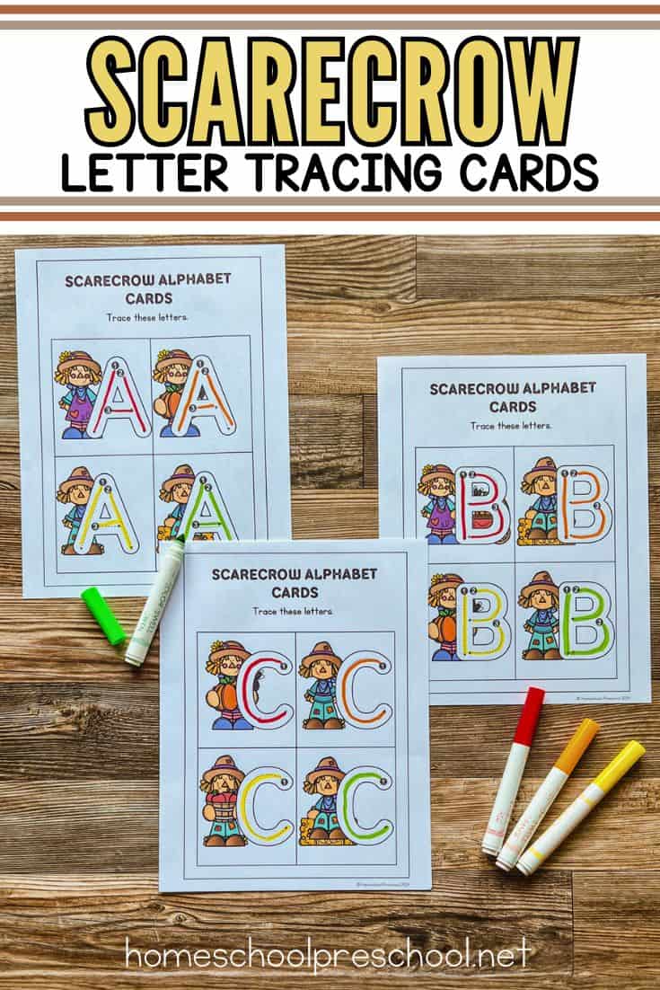 You’ll need scarecrow alphabet printables, pencils or crayons, and a space for children to trace their letters.