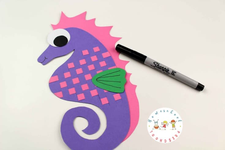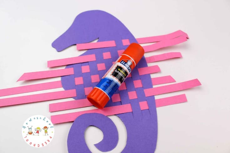 The best part about this art project is that it will really help your preschoolers build fine motor skills as they cut the paper strips and weave them to create the seahorse.