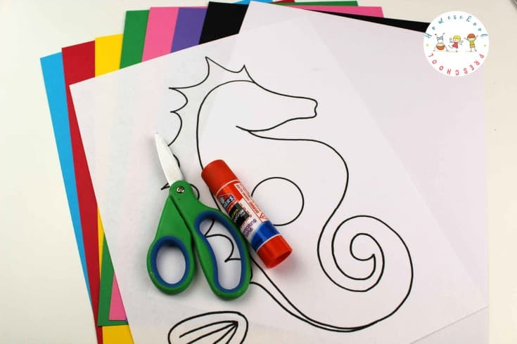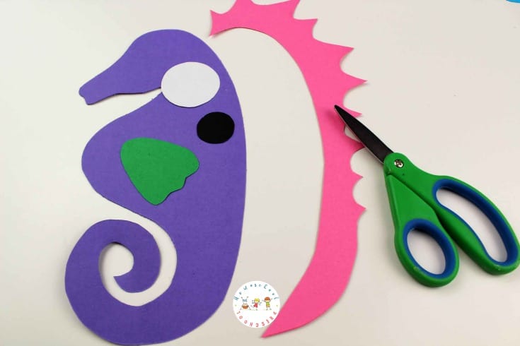 Download the seahorse template and print out. You can find the template at the end of this post. Cut the template out. Trace the seahorse onto colored cardstock and cut out.