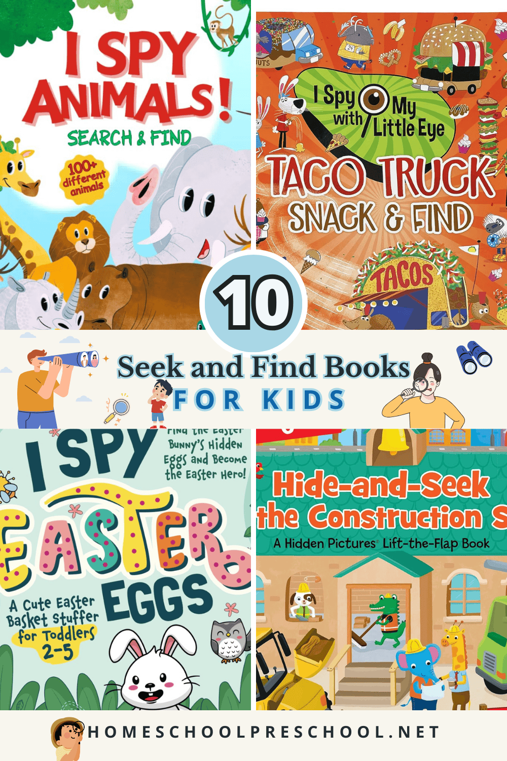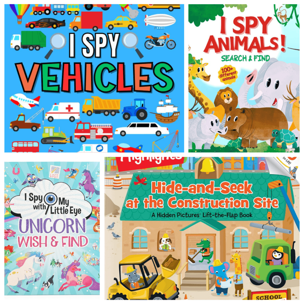 Imagine searching a busy construction site for tools, hunting for Easter eggs, or even spotting unicorns! There are book suggestions featuring animals, vehicles, and just about anything you can think of.
