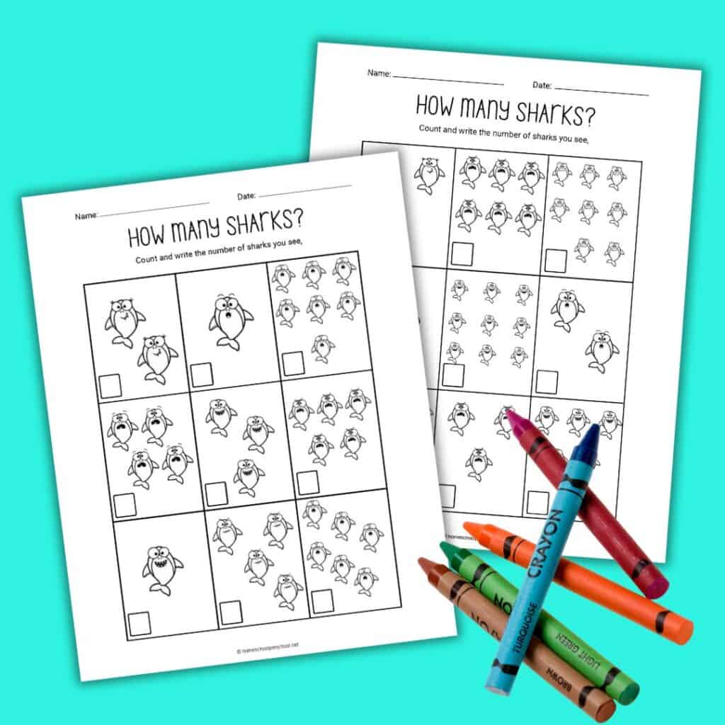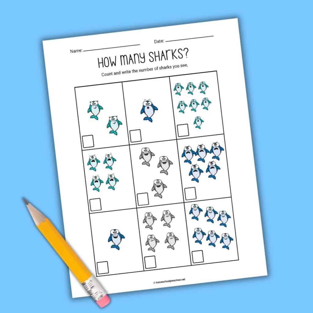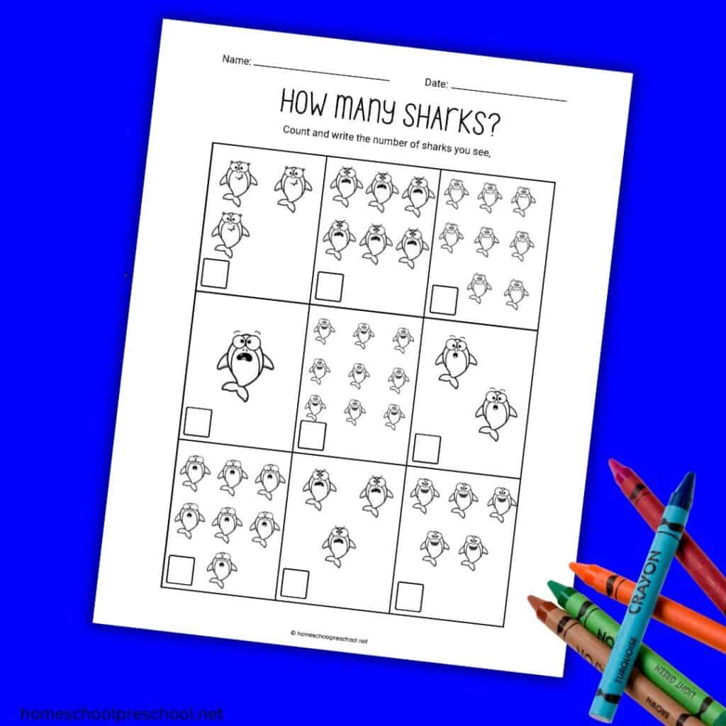 Let them practice writing numbers next to the corresponding group of sharks. After correctly counting the groups, allow them to color each shark.