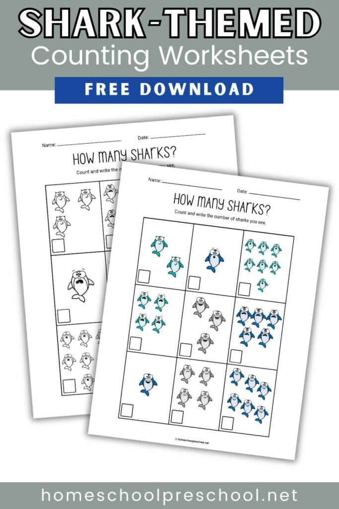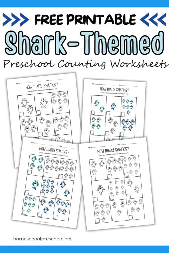 Each sheet includes various counting exercises, like identifying numbers, matching sharks to their corresponding numbers, and counting groups of sharks. The playful ocean theme keeps children engaged and eager to complete each task.