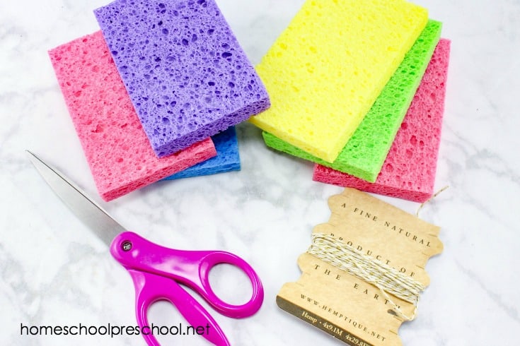 Take a piece of string and tie around all the sponge pieces. Make sure to pull the string very tight and knot it. Cut off the excess string.