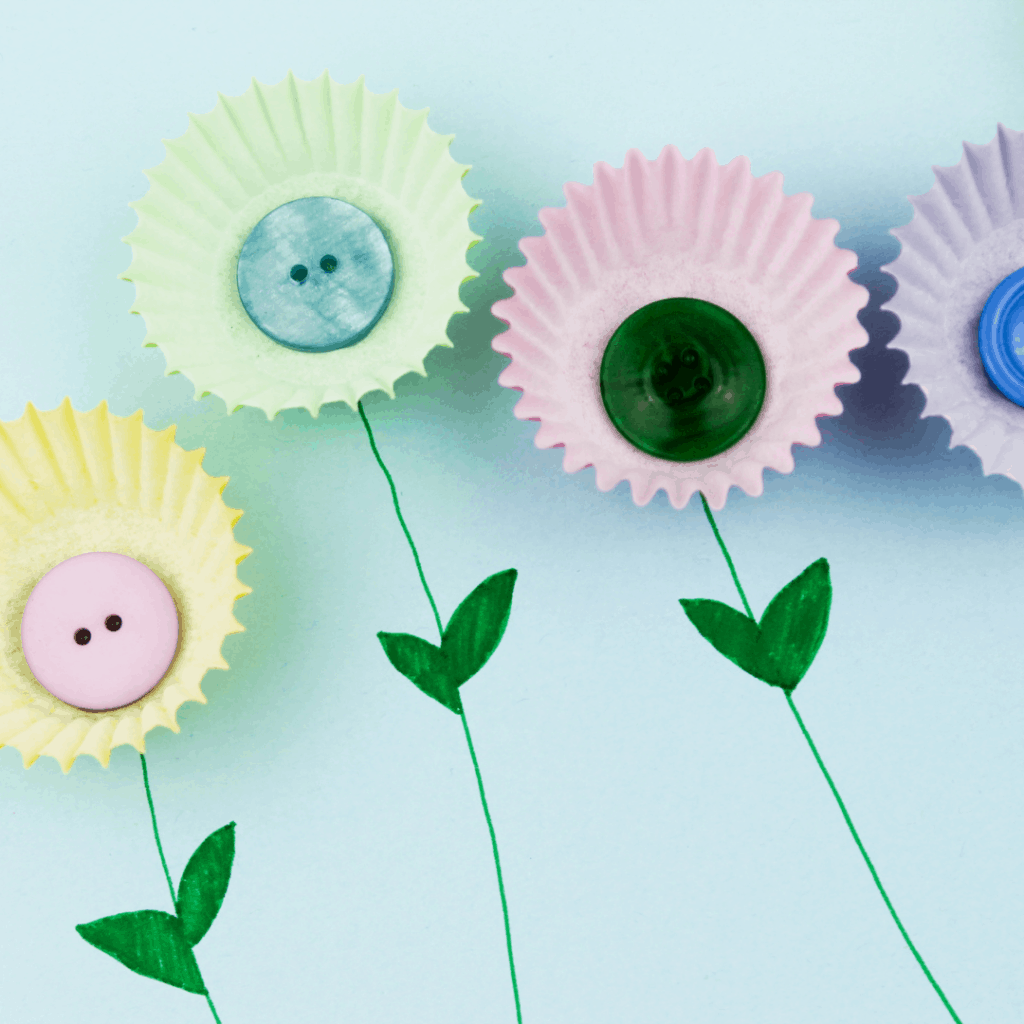 Just mini cupcake liners, a few buttons, some cardstock, and a green marker. Your child places the liners, glues them down, draws the stems, and presses a button into the center of each flower. The ruffled edges of the cupcake liner do all the work — they look exactly like flower petals without any shaping required.