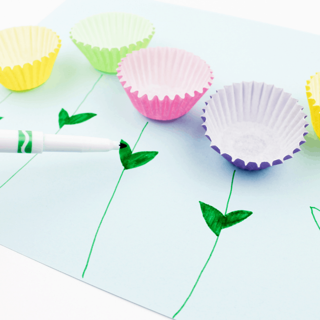 Have your child place the liners on the cardstock wherever they’d like their flowers. Leave space below each one for the stem. Let them decide how many flowers, which colors, and how to arrange them.