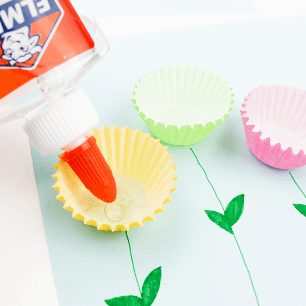 Tip: Mini baking cups work better than standard size for this age. They’re easier for little hands to manage, and they look more like real flowers on the paper.