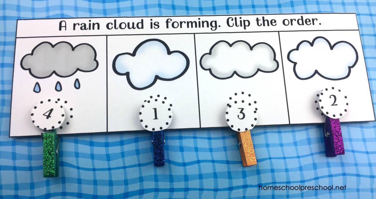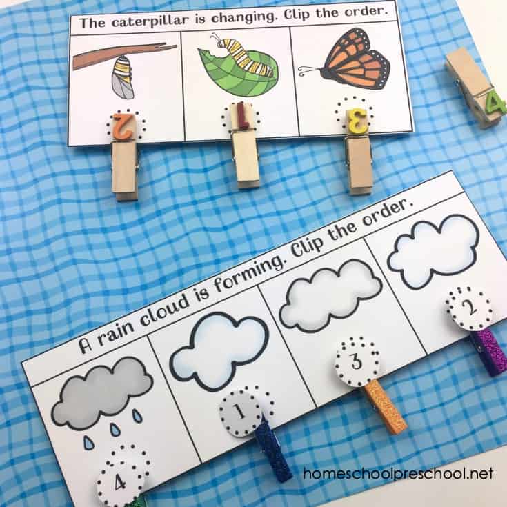 This set of free preschool printables is so much fun. Kids will build fine motor skills as they work with clothespins or counters to put these spring events in the correct order.