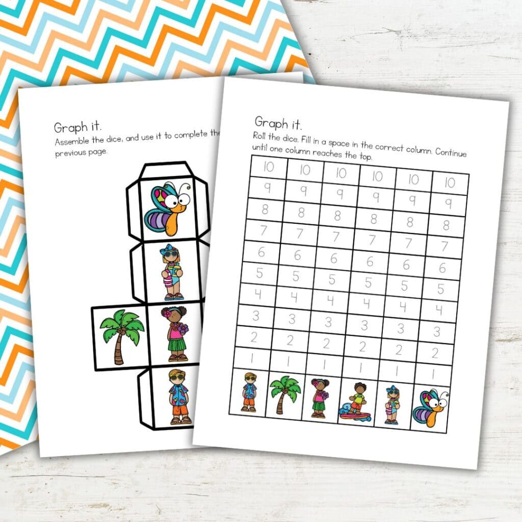 This activity helps preschoolers practice counting, number recognition, and early graphing skills in a fun way. Kids roll a dice, find the matching number on the graph, and fill in a space in the correct column. They keep rolling and marking their graph until one column reaches the top. This simple game introduces data collection and comparison skills without feeling like work. It’s a great way to build number confidence while keeping kids engaged!