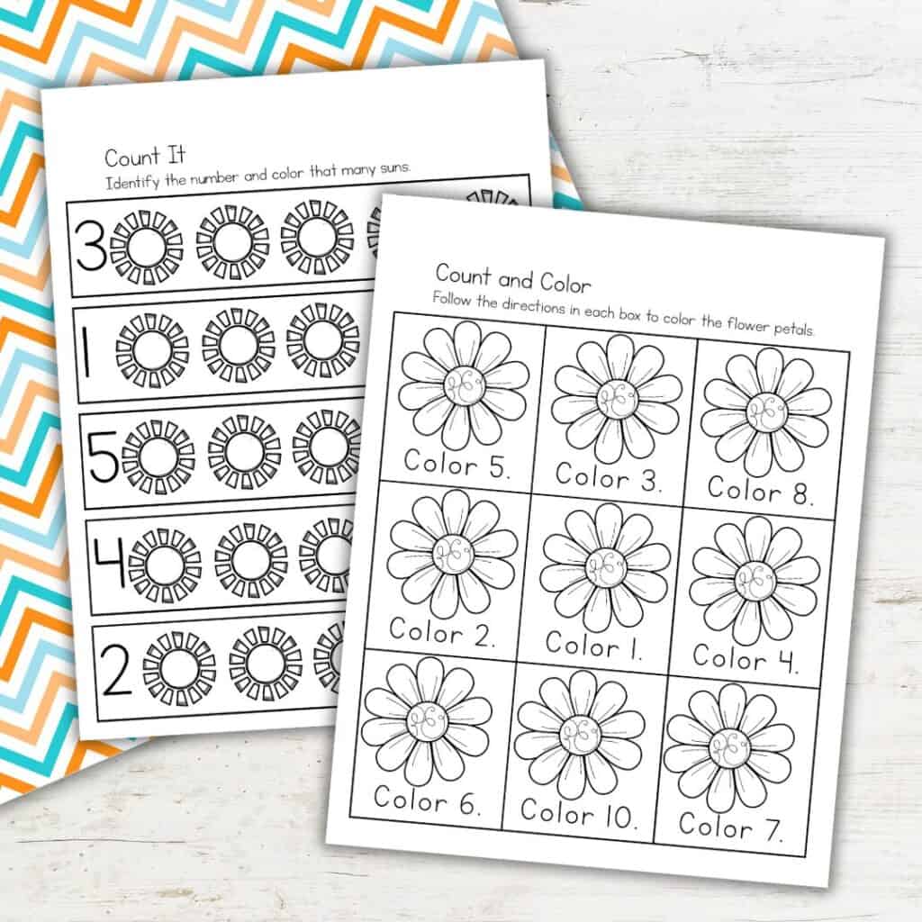 - Counting practice – Count suns, bees, and flowers, then color the correct amount.