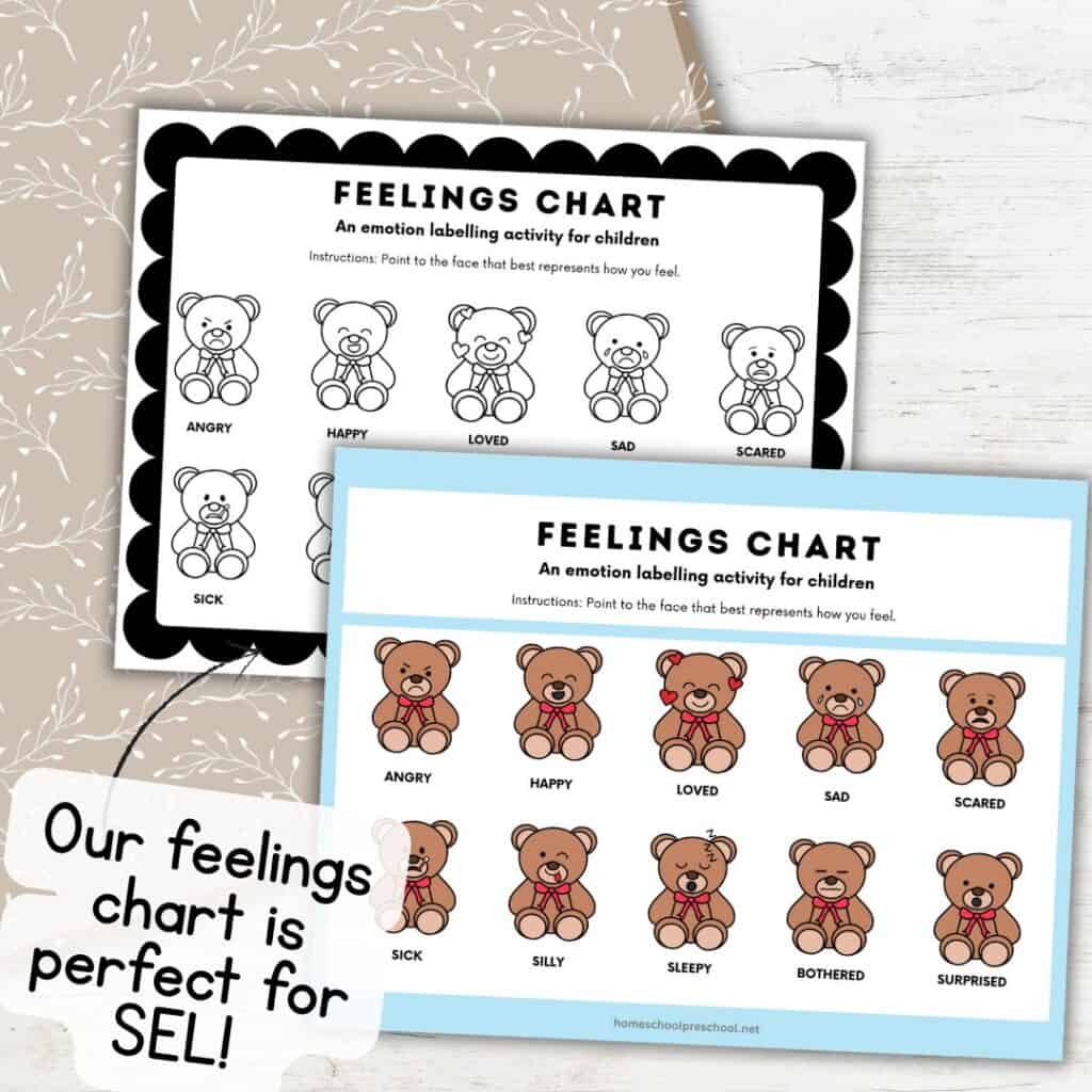 Teddy bear feelings chart: Use a simple chart with bear faces showing different emotions—happy, sad, silly, sleepy—and talk about how your bears are feeling today. It’s a gentle way to build social-emotional skills through play and imagination.