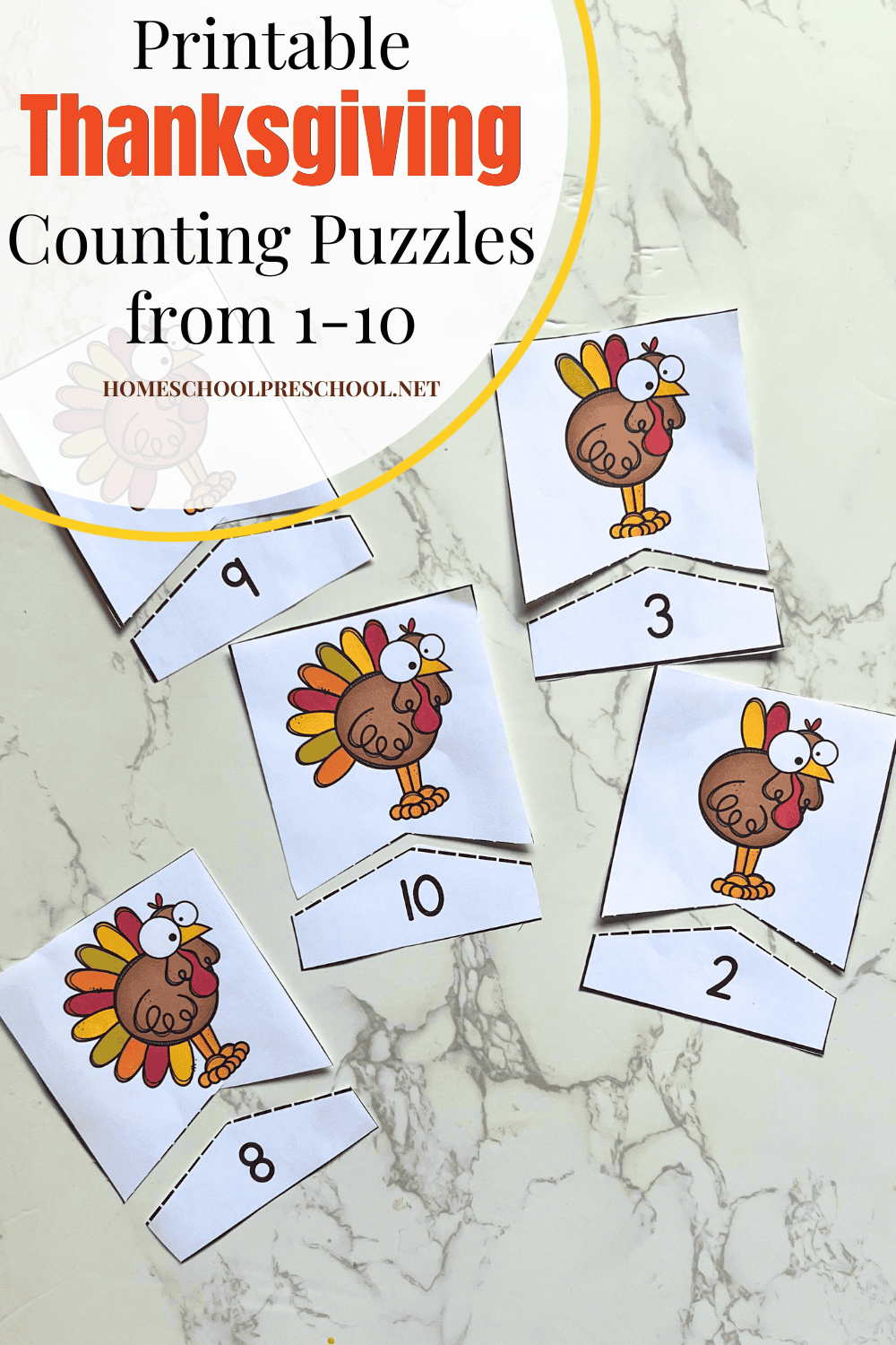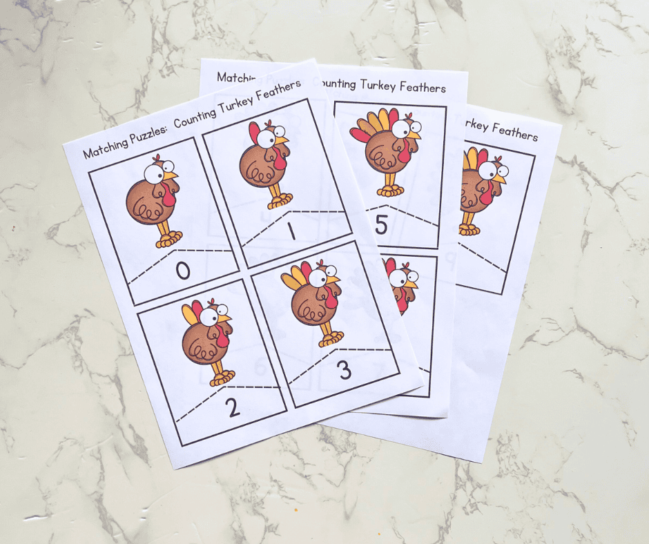Your preschooler’s task is to count the feathers on each turkey and match it to a puzzle piece with the corresponding number.