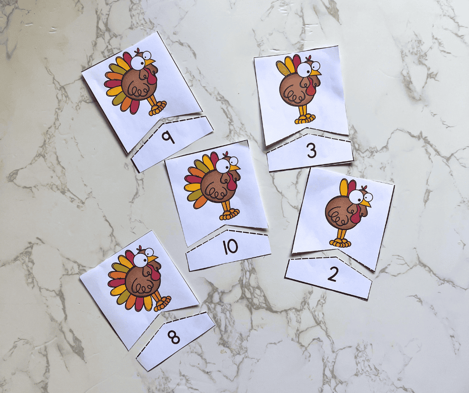 Alright, let’s get into the nitty-gritty of this Thanksgiving activity for preschoolers. One of the pieces in each two-piece puzzle features a cute little turkey with a varying number of feathers, ranging from zero to eleven. The other piece features numerals 0-10.