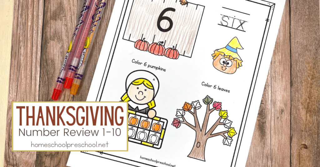 These Thanksgiving worksheets will help your preschoolers learn numbers 1-10. They’ll work on number recognition, number words, counting, and one-to-one correspondence.