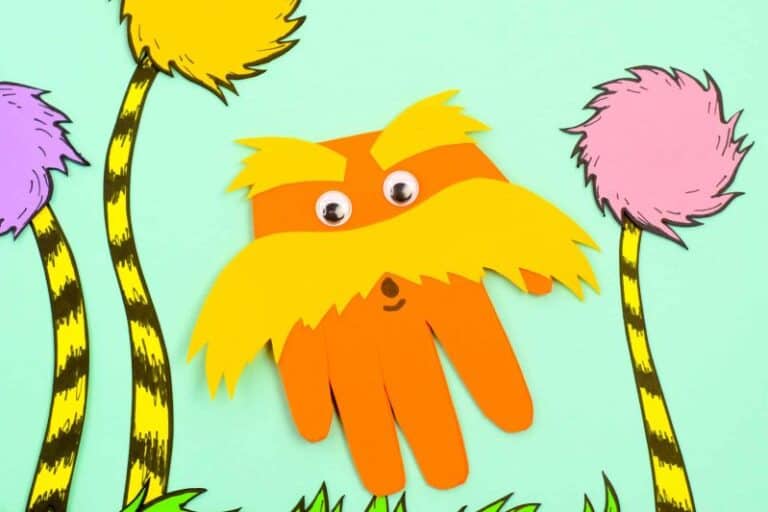 Capture memories with The Lorax-Inspired Hand Print Craft that transforms little hands into adorable Lorax characters.