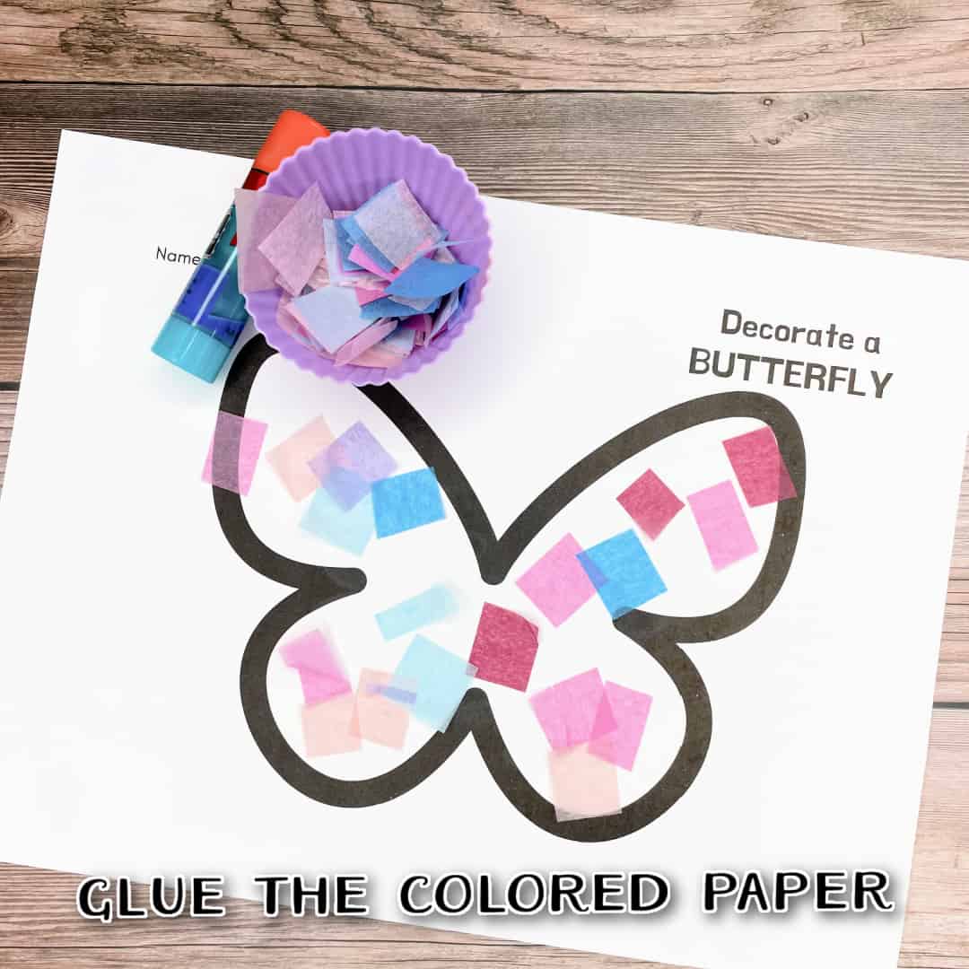 If desired, little ones can color the butterfly before adding the paper squares. Now, it’s time to get started.