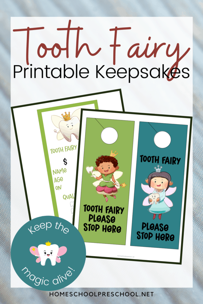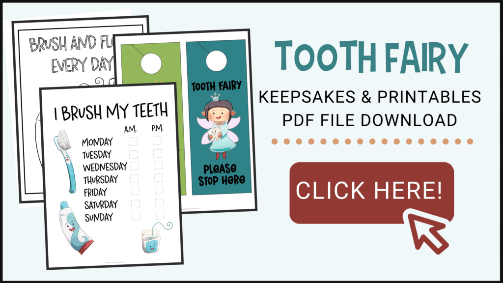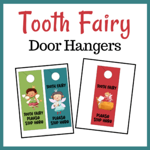 Tooth Fairy door hangers are the perfect way to let the Tooth Fairy know which room to enter. Print, laminate, and cut apart the door hangers. Have your child hang one on their doorknob before going to sleep.