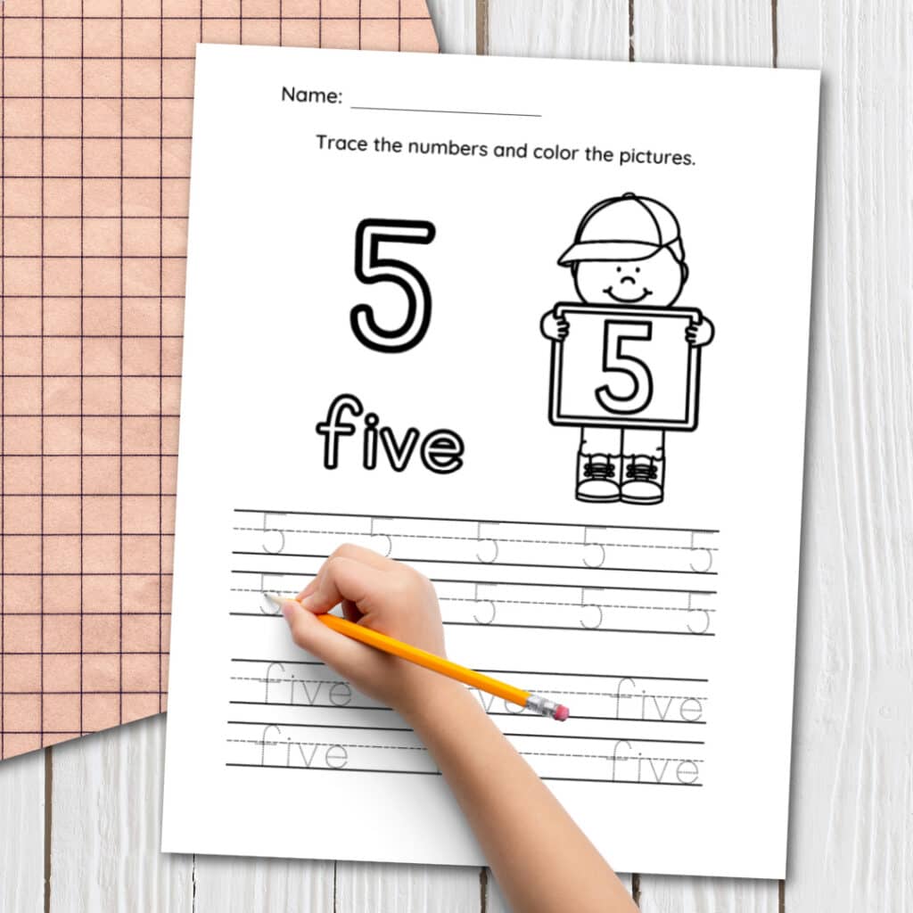 This can be done by tracing the number 5 over and over again on our worksheet. Additionally, students can practice writing the number 5 on their own on the backside of the printable.
