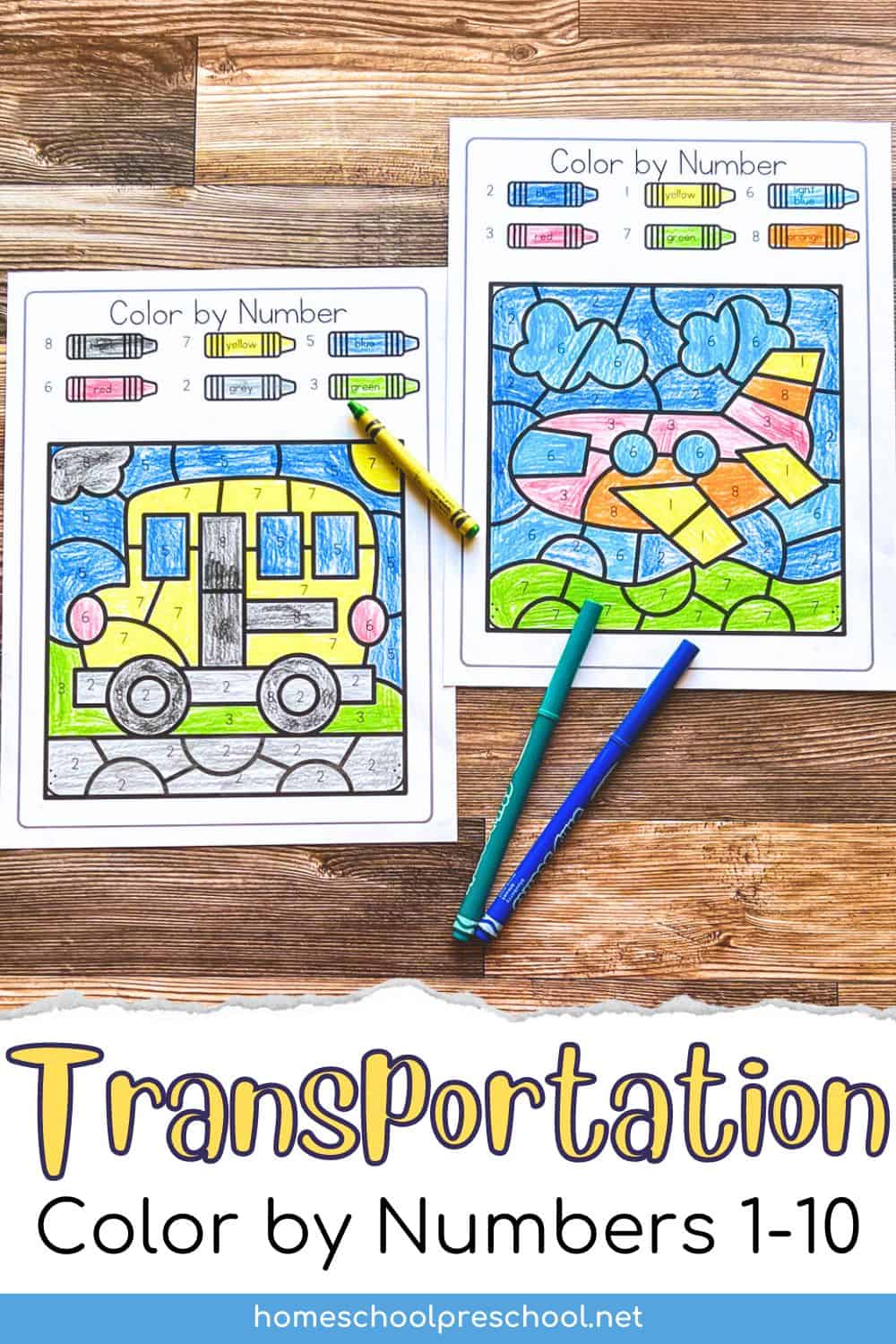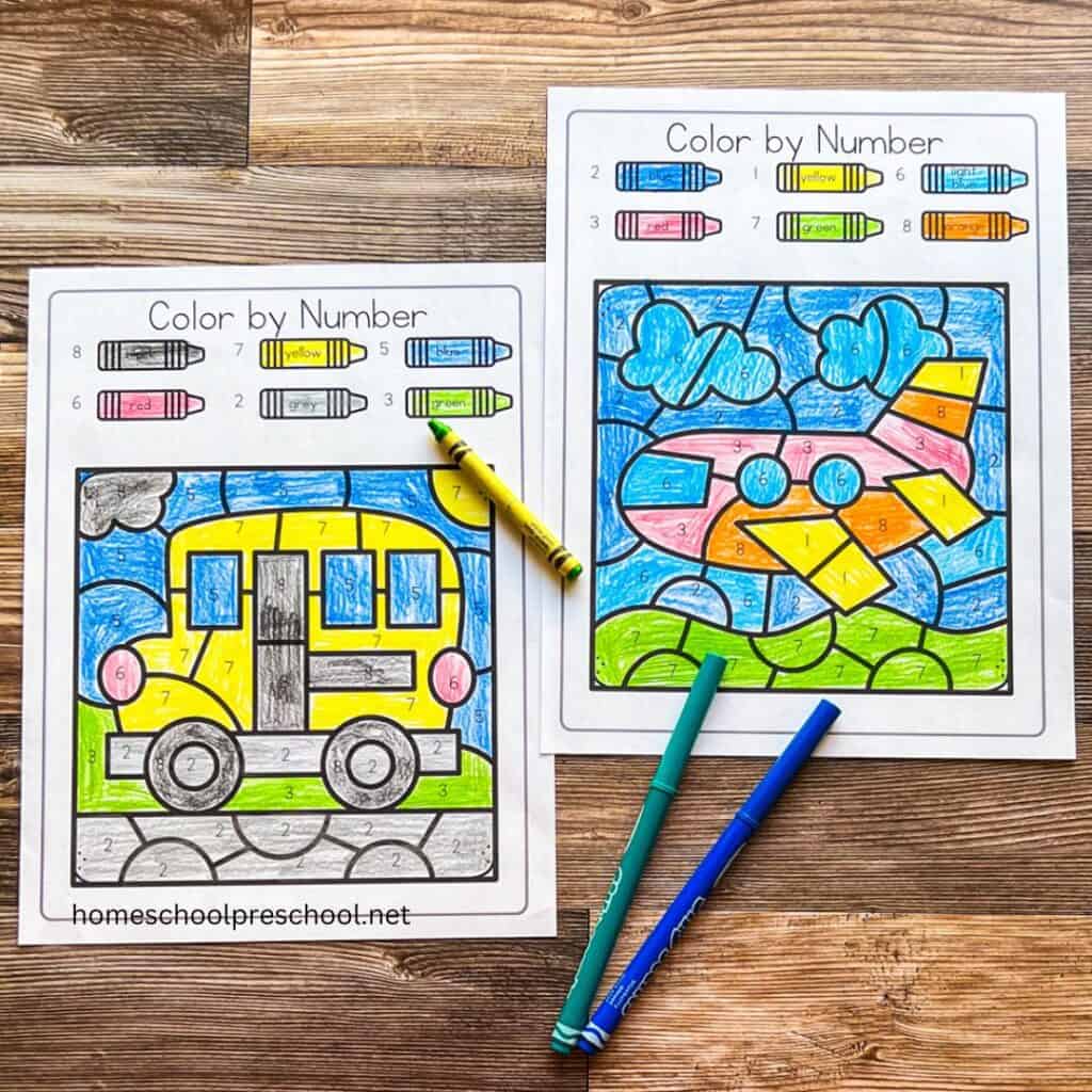 Transportation color by number worksheets are simple yet effective tools for teaching preschoolers about different modes of transportation while practicing coloring and number recognition.