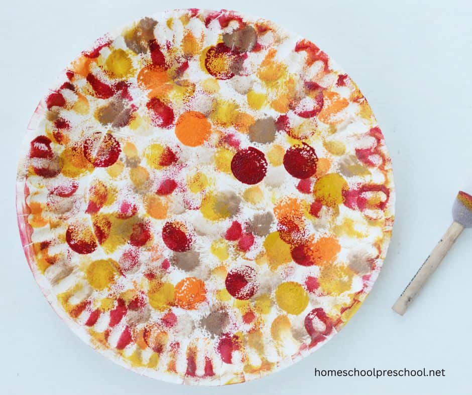 Use the sponge to dab fall-colored paints to decorate the paper plate.