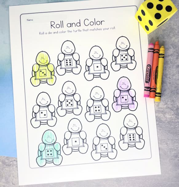 Students will practice subitizing to six. They’ll roll a die, determine the number of dots on the face, and then color the turtle holding the same number.