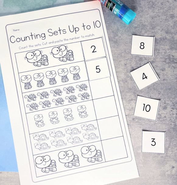 Students will count sets of turtles and paste the corresponding in the box. In addition to practicing counting and number recognition to ten, cutting the numbers out is a great way to strengthen fine motor skills.