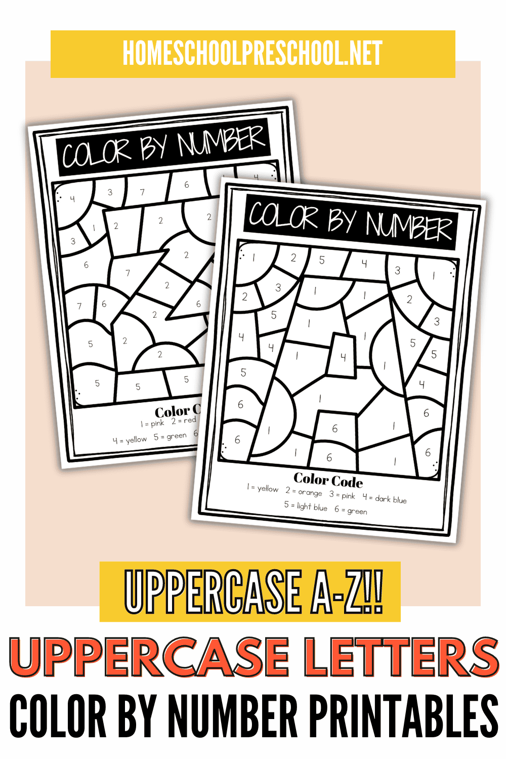 This pack includes twenty-six alphabet printables. Your kids will love reading the color code and coloring the picture to reveal the uppercase letter hidden on the page.