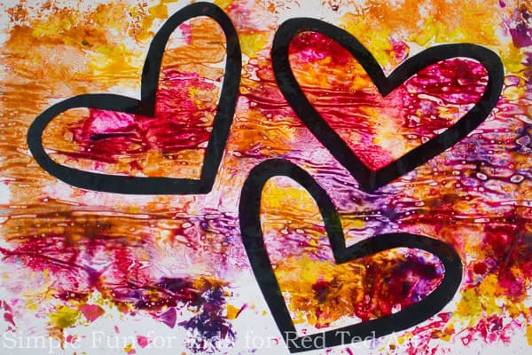 Kids trace a heart template with black glue mixed with acrylic paint, let it dry overnight, then color the sections with Sharpies on clear plastic. Cut it out and tape to a window. Takes about 15 minutes of active work plus drying time. Uses recyclable plastic from food containers, white glue, black paint, and markers.