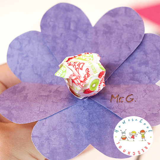 Cut out paper hearts, punch holes, and stack them to make a flower that wraps around a lollipop stick. Kids practice scissor skills and hole punching while making cards they can hand out.