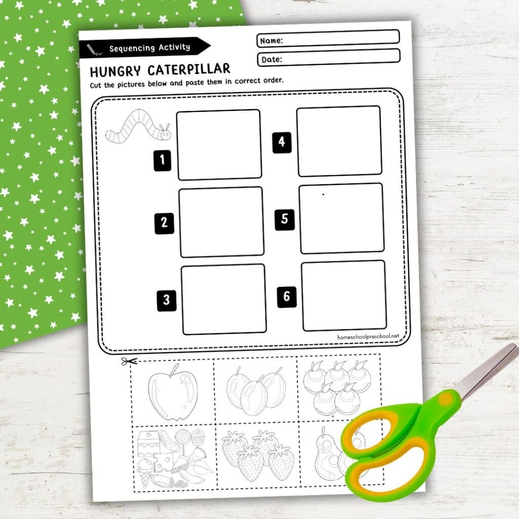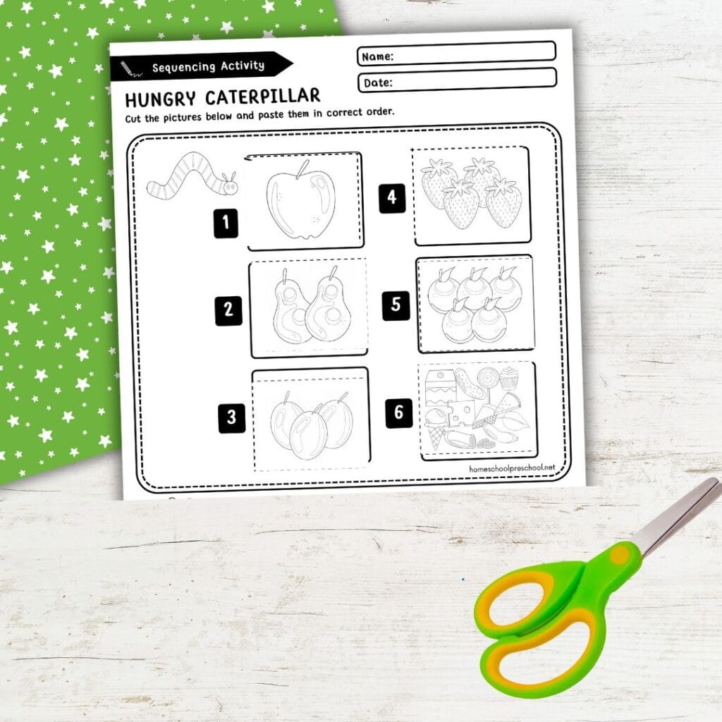 These worksheets help kids practice sequencing by allowing them to cut out and arrange pictures in the correct order, just like the events in the very hungry caterpillar. As they work to put the foods in the right sequence, children begin to understand how stories flow—what happens first, what comes next, and what happens last.