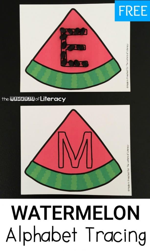 The object of these watermelon seed alphabet tracing cards is to use black bean “seeds” to fill in each outlined letter on the watermelon cards.