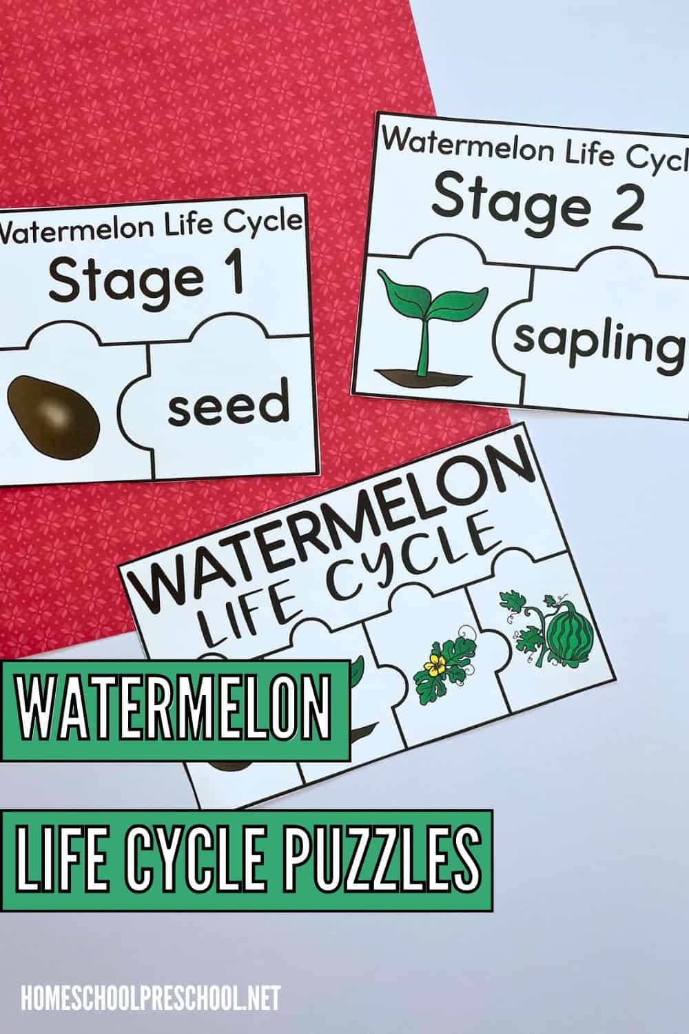 This watermelon life cycle printable is so much fun for preschoolers and kindergarteners. These life cycle puzzles are fun to learn with and perfect for summer science lessons.