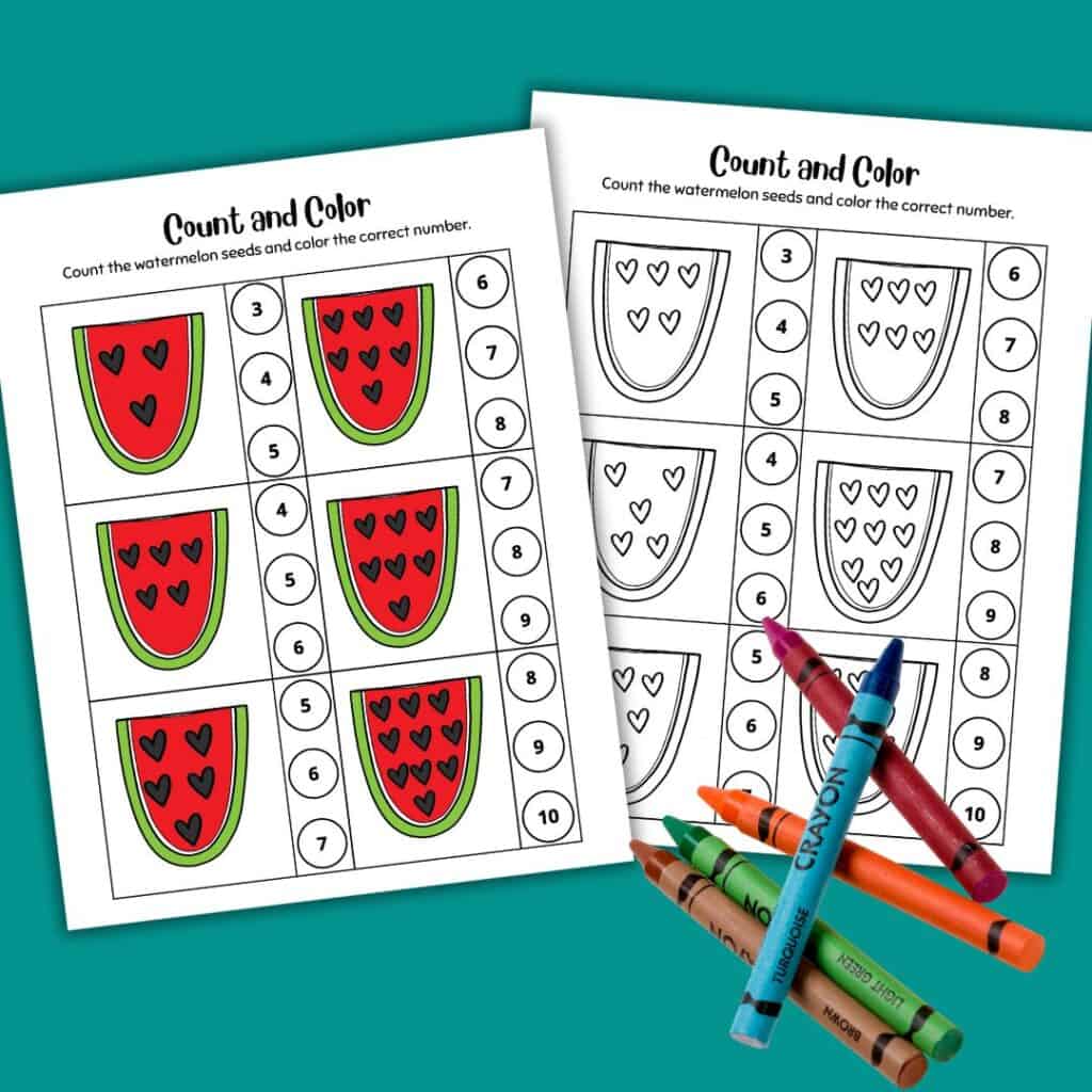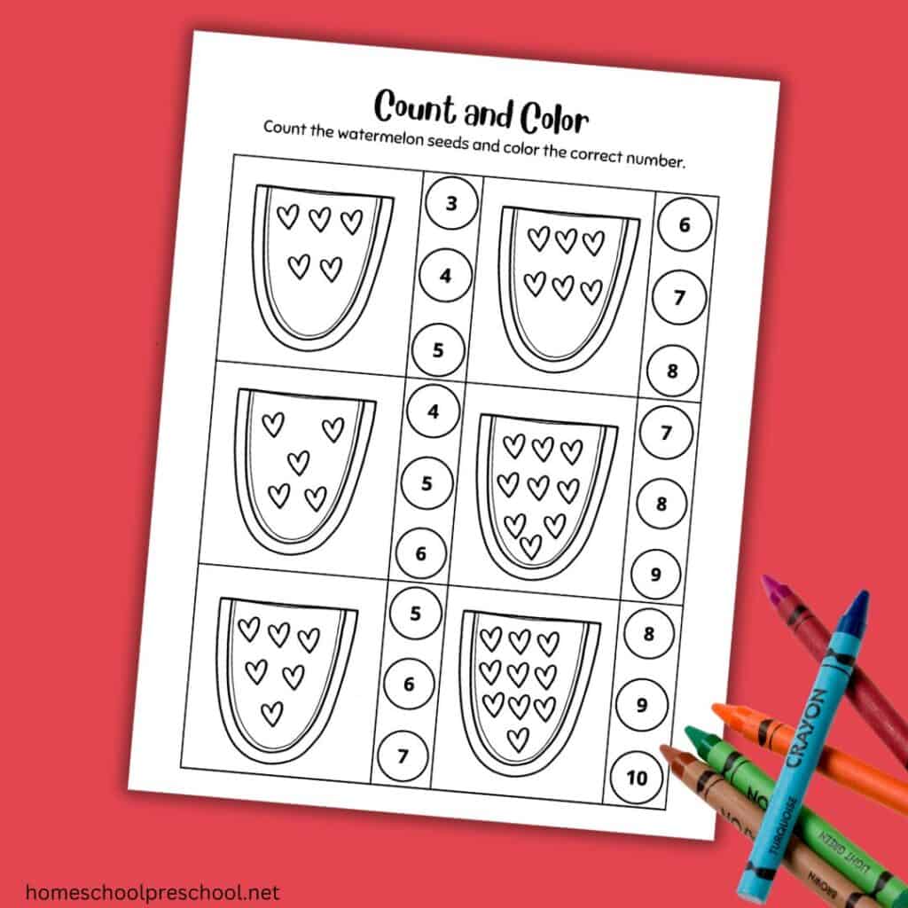 Kids can count the number of seeds on the watermelon and then color the corresponding number on the side. This is a great way to help them practice one-to-one correspondence, an important foundation for early math skills.