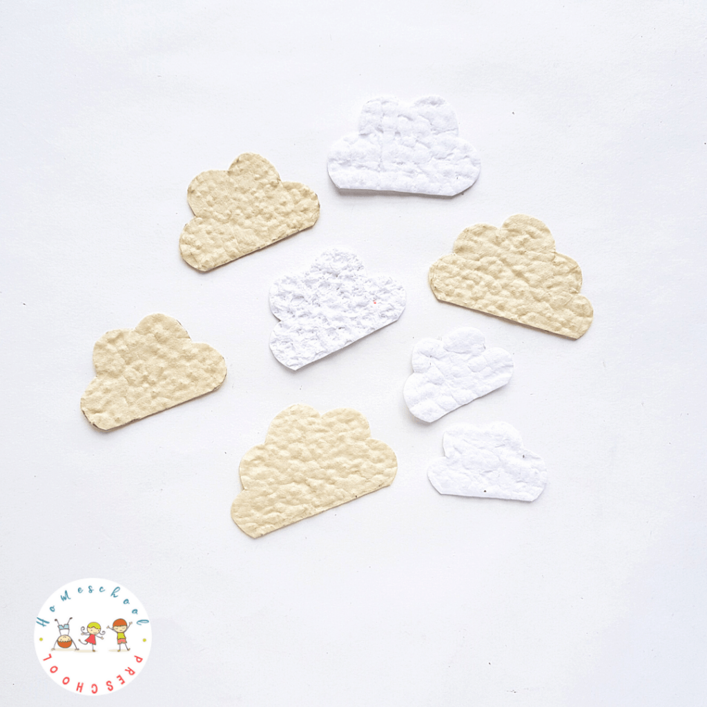 You could use white, cream or grey colored embossed papers for the clouds. Trace the cloud patterns on the selected papers and cut them out.
