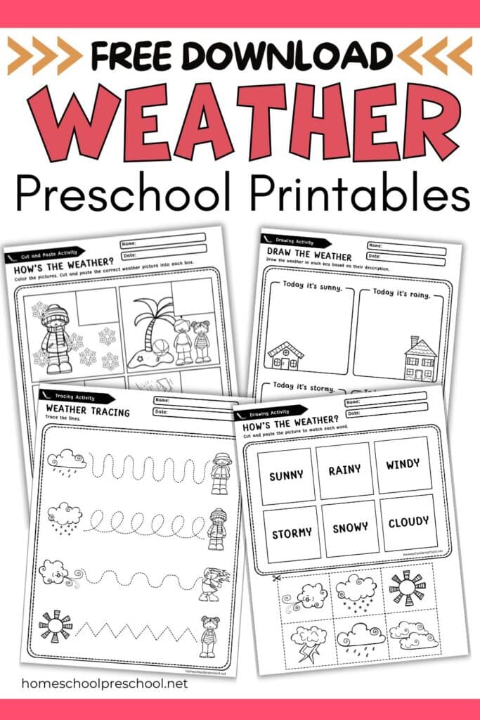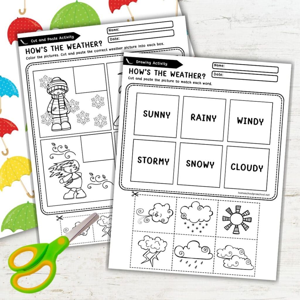 Make learning about the weather fun and interactive with these weather preschool worksheets! Designed for preschool and kindergarten learners, this printable pack helps children explore different types of weather while practicing important early learning skills. As they trace, color, cut, and paste, kids will strengthen their fine motor skills, observation skills, and early literacy development—all through playful, hands-on activities.