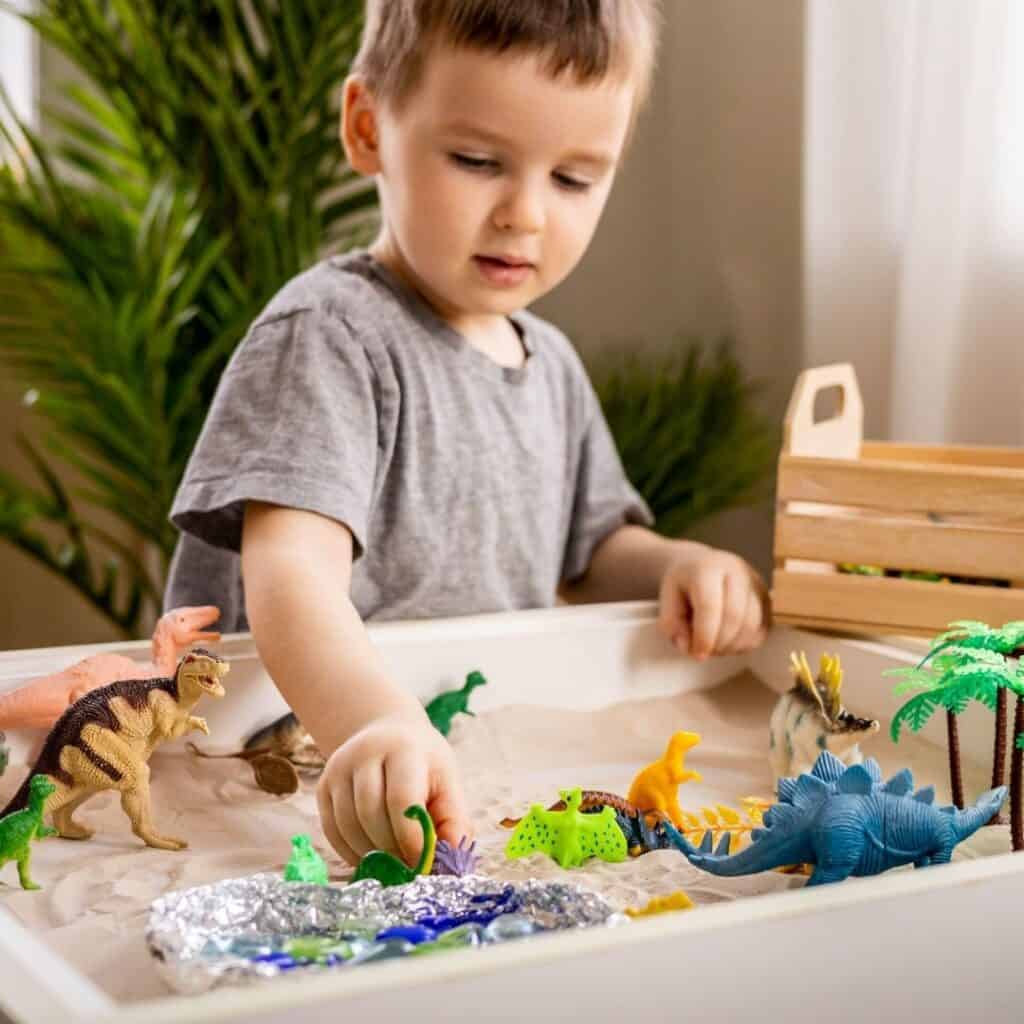Fill a bin with sand, dried beans, or kinetic sand and bury toy dinosaurs or pretend bones. Give kids paint brushes or scoops and let them “excavate” like real paleontologists. It’s a great way to build fine motor skills and spark scientific thinking.