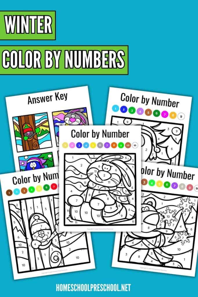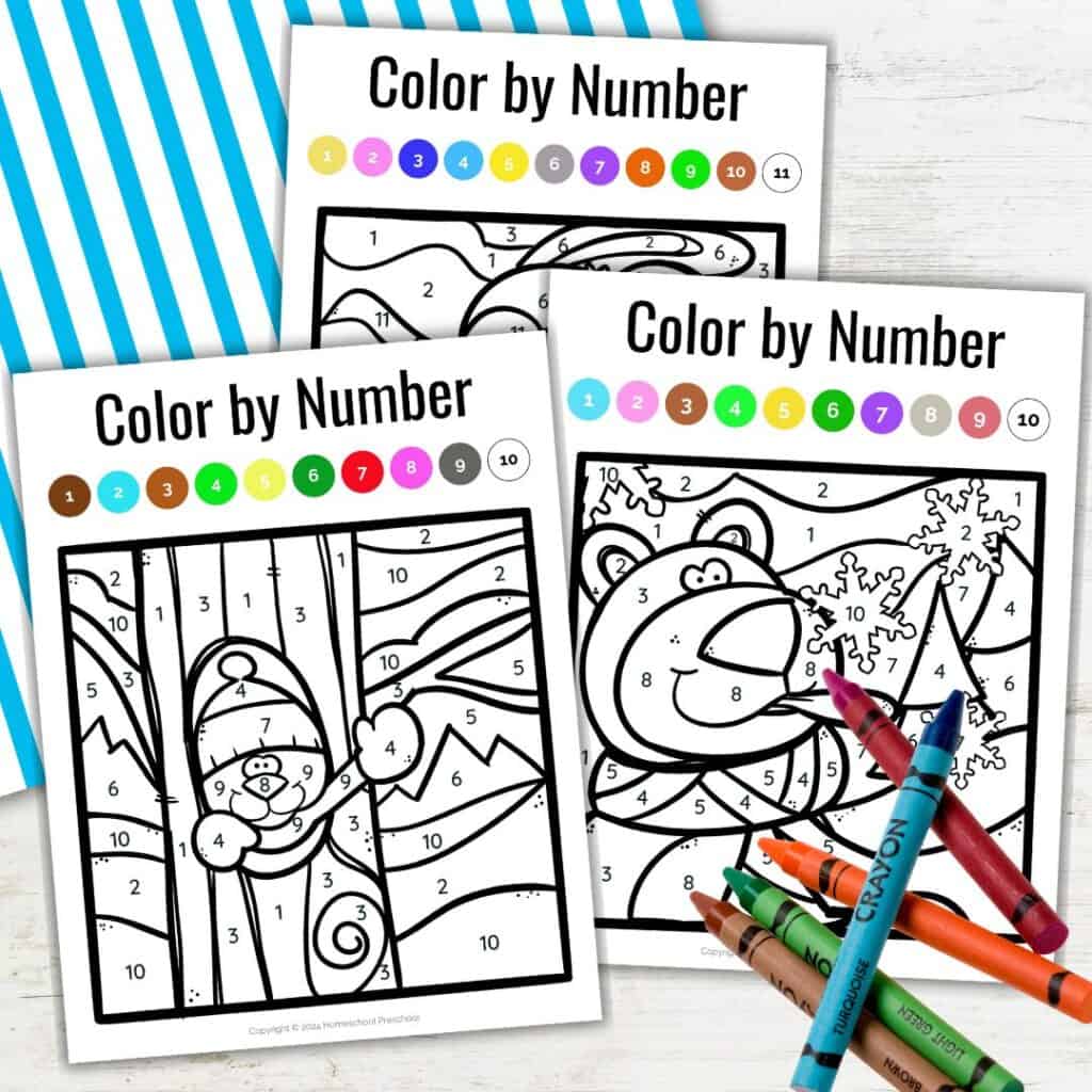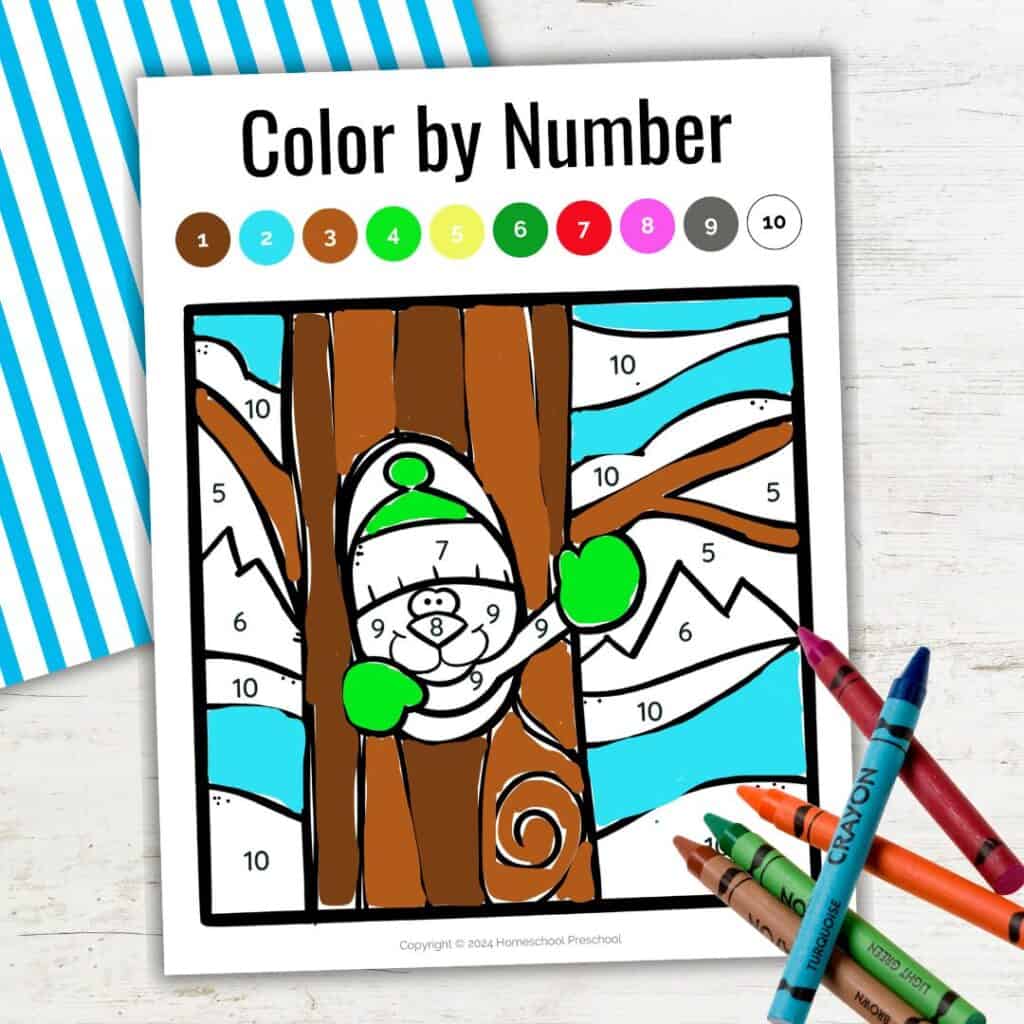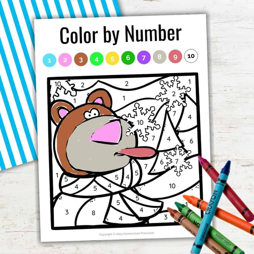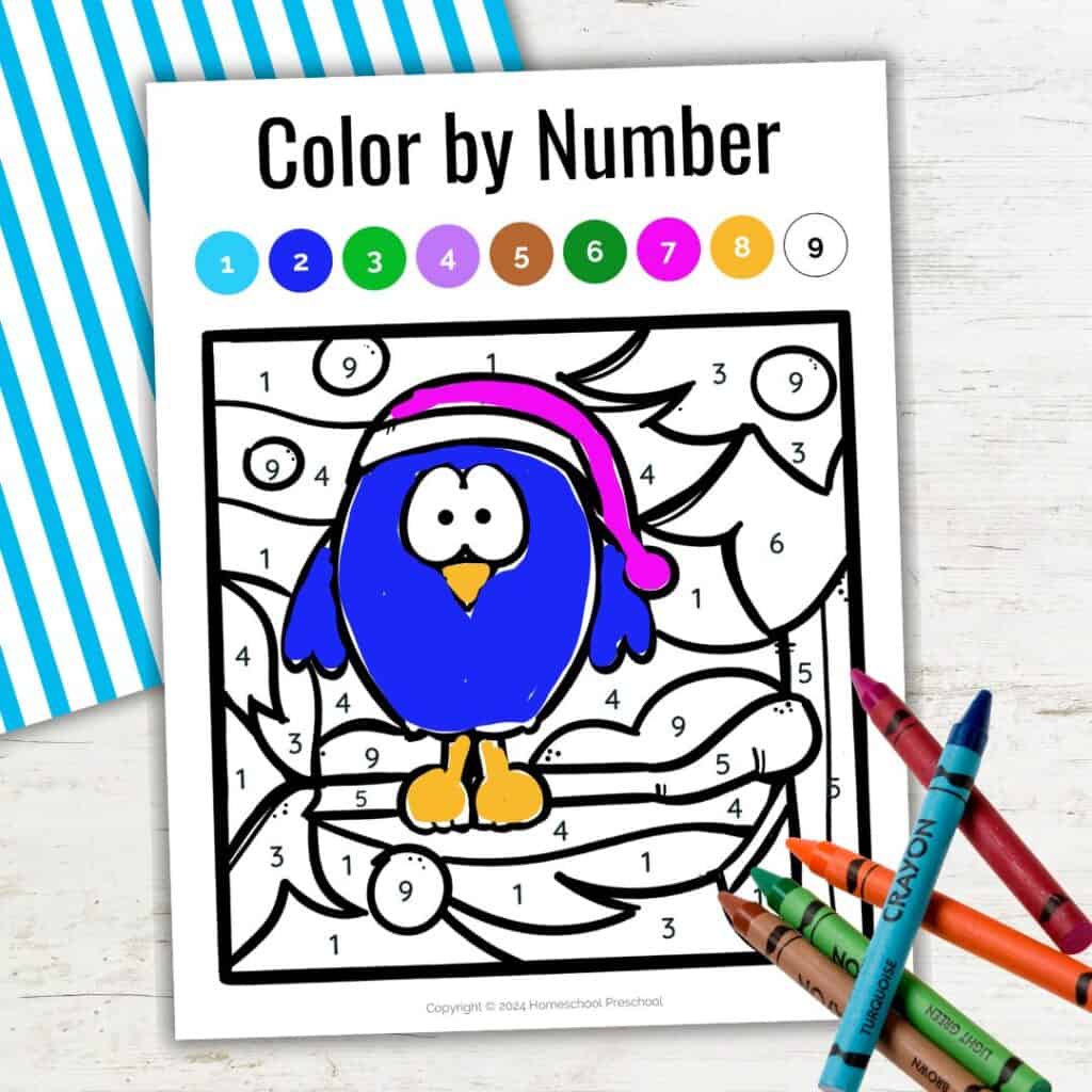 The winter color-by-number printable pack is a simple, fun way to help kids build important early learning skills. It supports number recognition, color matching, fine motor development, and more, all while keeping kids entertained.
